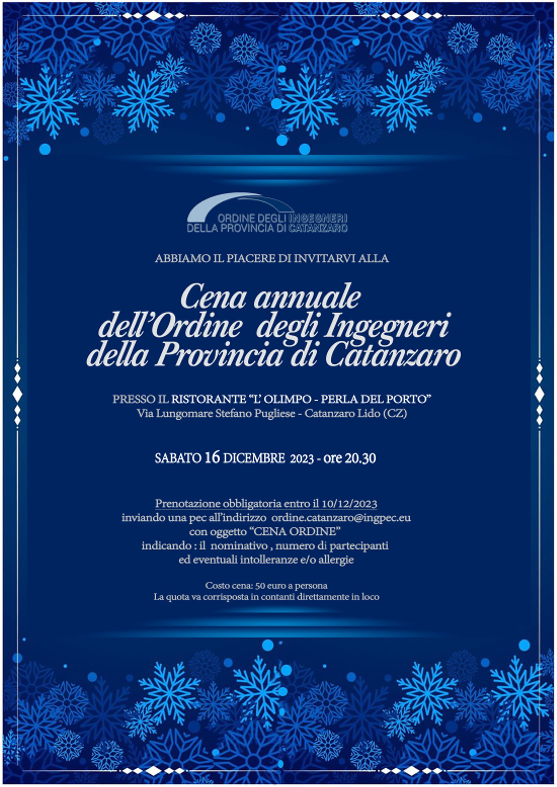 La prenotazione è obbligatoria entro il 10/12/2023 e può essere effettuata inviando una pec all’indirizzo ordine.catanzaro@ingpec.eu con oggetto “CENA ORDINE” indicando : il nominativo , numero di partecipanti, numero menù bambini, se si preferisce il menù di carne ed eventuali intolleranze e/o allergie.
